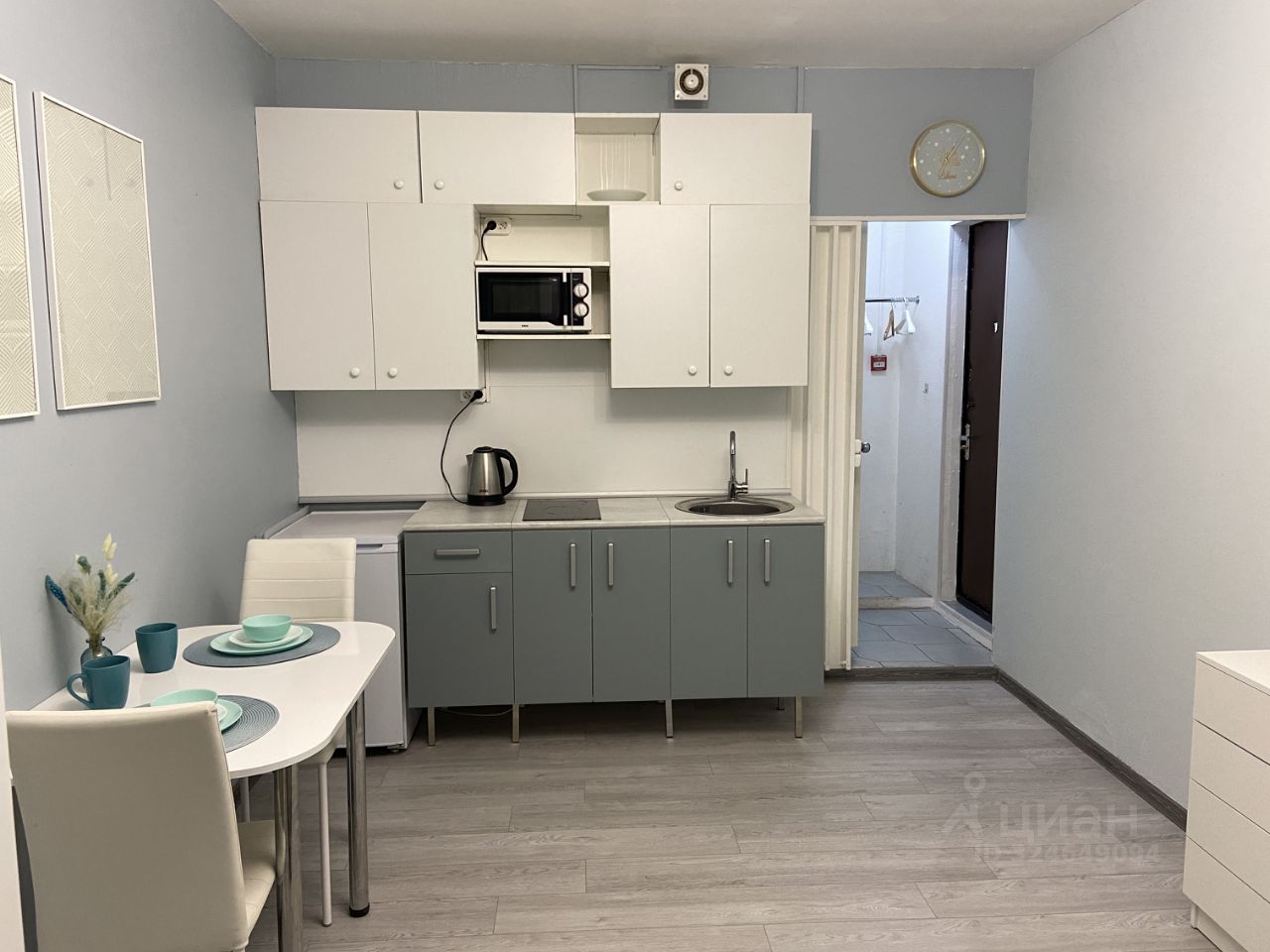 Кухня , в ней находится: кухонный гарнитур, чайник, микроволновая печь,керамическая панель, холодильник.