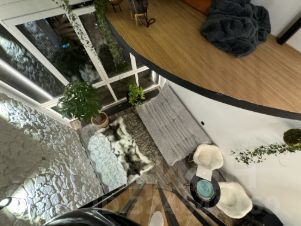 Живые кокедамы по всему периметру и экзотичная пальма обеспечивают пространство дополнительным кислородом . Кондиционер с функцией обогрев до -25 за окном . Деревянные полы , стиральная машина, увлажнитель воздуха, многоуровневый свет. Волшебная атмосфера в которой хочется и жить и работать и отдыхать.