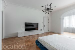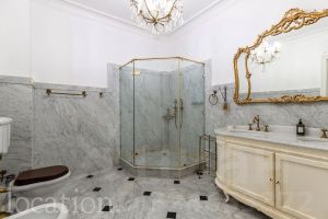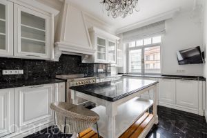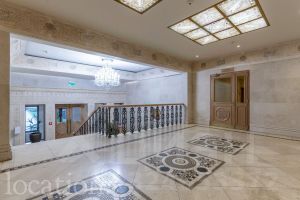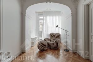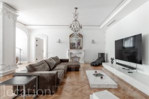В отделке использованы эксклюзивные материалы: натуральный мрамор и ценные породы дерева. Интерьер в классическом стиле наполнен естественным светом и отличается вниманием к деталям — паркет Французская ёлка, лепной декор, высокие потолки с роскошными люстрами и мягкое ковровое покрытие.