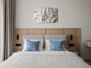 - спальная зона двуспальной кроватью с размером 160/200, прикроватная тумба и шкаф.