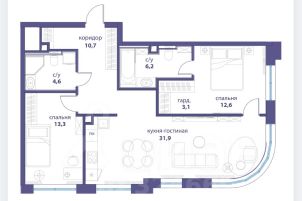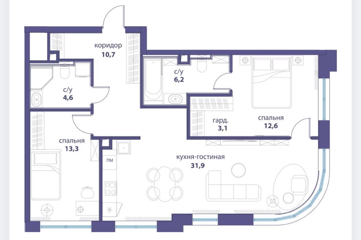Два сан.узла, полноценная прихожая, большая кухня с гостиной разделяют спальни.