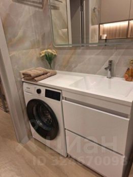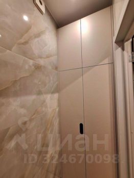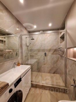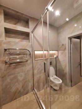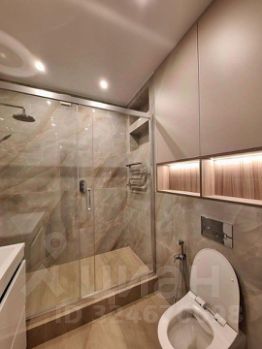 Ванная комната с просторной душевой, также есть отдельный туалет при входе в квартиру, где расположено место для хранения. Отдельно имеется вместительная гардеробная.