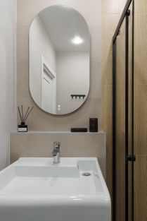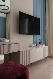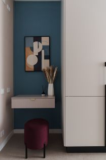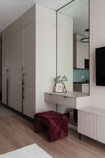 Предусмотрены зоны хранения для одежды, а также туалетный столик с зеркалом от пола до потолка.