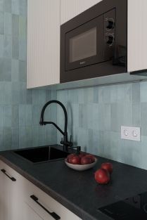 В зоне кухни полный комплект встроенной техники, включая холодильник с морозильной камерой, микроволновую печь, индукционную варочную поверхность и вытяжку. Предусмотрены удобные места для хранения посуды и продуктов, а также элегантная обеденная зона.