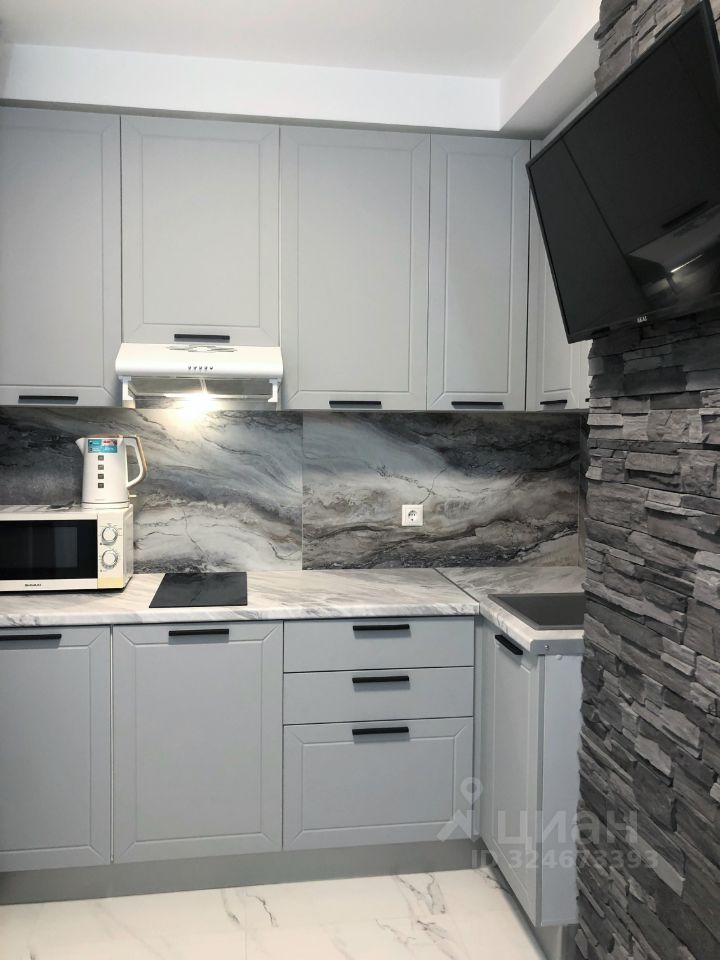 Квартира после ремонта, оборудована современной мебелью и техникой: встроенная мебель, варочная поверхность, микроволновая печь, холодильник, стол и стулья в кухне;