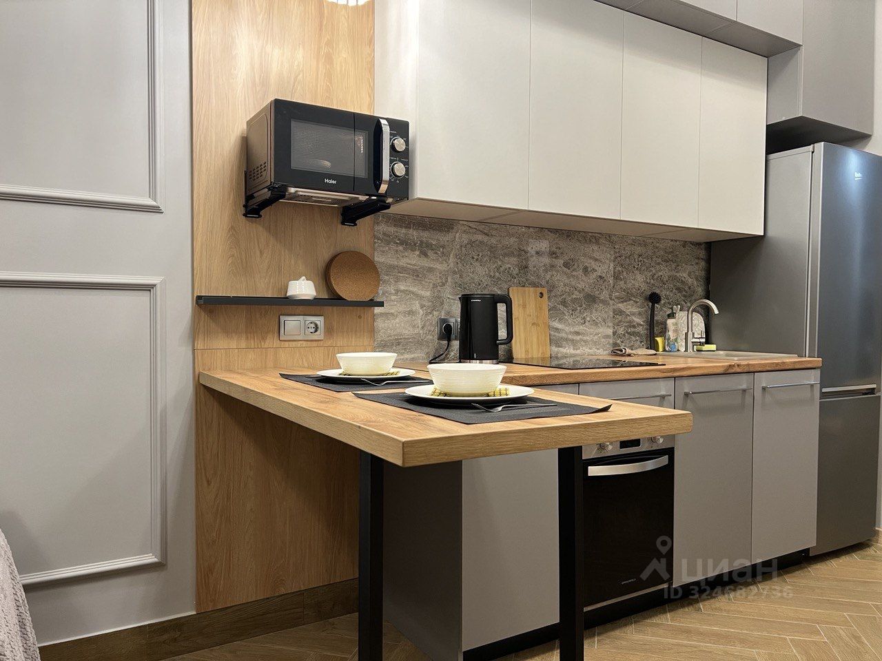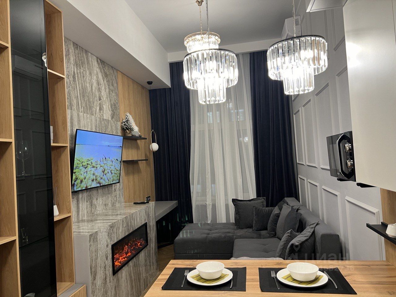 Квартира укомплектована всей необходимой для проживания мебелью, техникой (посудомоечная, стиральная машина, микроволновка, телевизор 43, интернет), предметами быта, шкафами для хранения и кондиционером.
