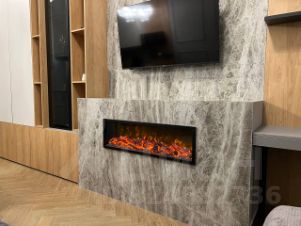 Встроенный камин создает домашнюю и теплую атмосферу вокруг, а кроме того, дает возможность полюбоваться язычками пламени в домашнем очаге, уютно расположившись в удобном кресле с книжкой или любимым напитком.