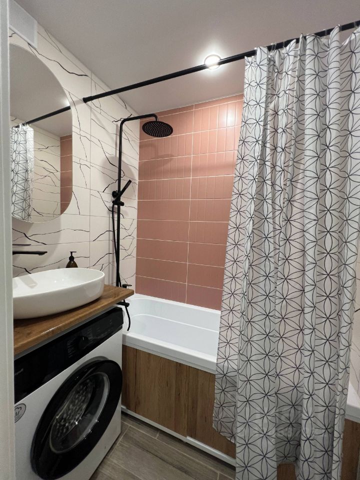 Есть всё для комфортного проживания: кухонный гарнитур, холодильник, варочная панель, стиральная машина, письменный стол, вместительный шкаф для хранения вещей, гладильная доска. Квартира готова к заселению.