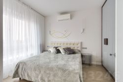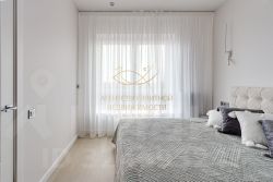 • Изолированная спальня: Двуспальная кровать с ортопедическим матрасом, вместительная гардеробная, кондиционер.
