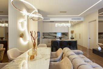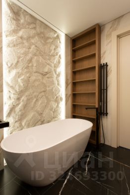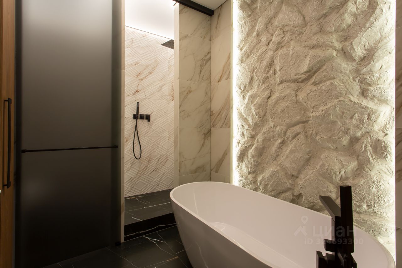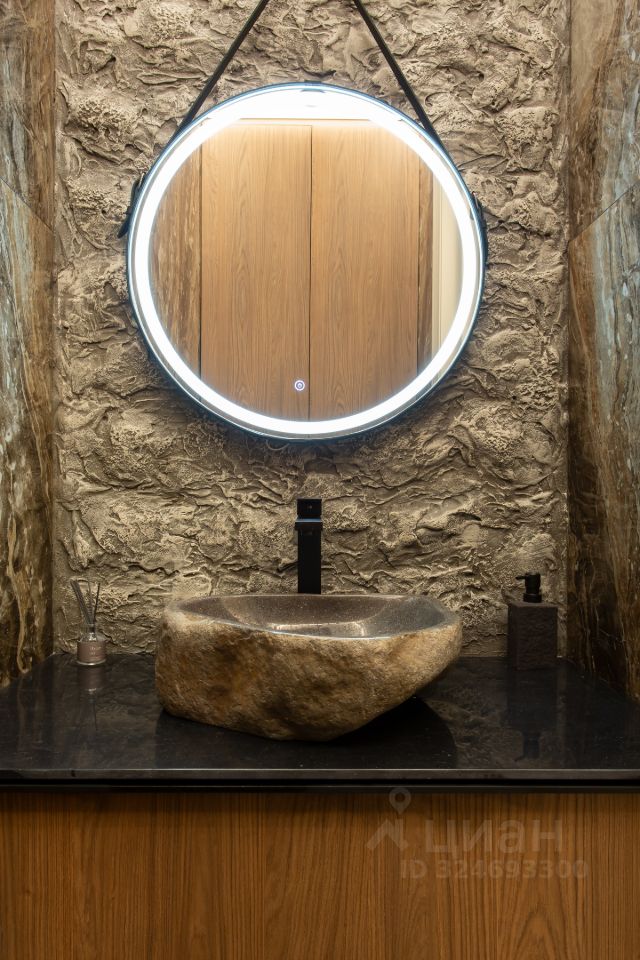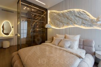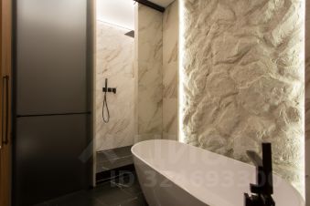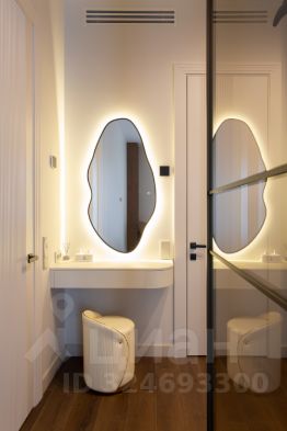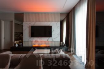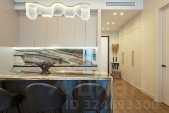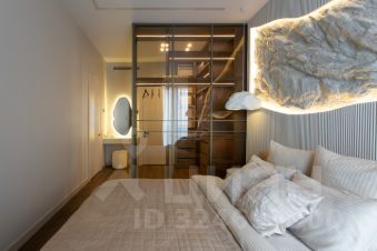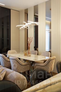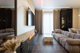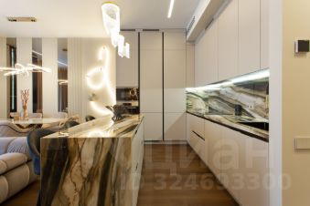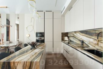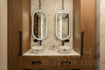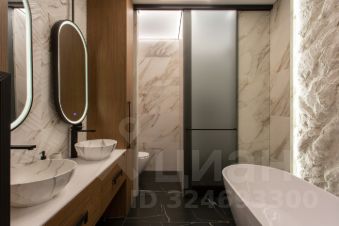Отделка санузлов выполнена крупноформатным керамогранитом, установлена встроенная сантехника. Также санузлы и гардеробная в прихожей оснащены теплыми полами. Вся корпусная мебель выполнена на заказ у ведущих производителей мебели. Столешница на кухне и острове из керамогранита. Встроенная система кондиционирования. Управление светом и шторами с помощью умногодома.