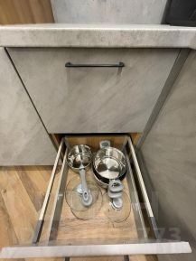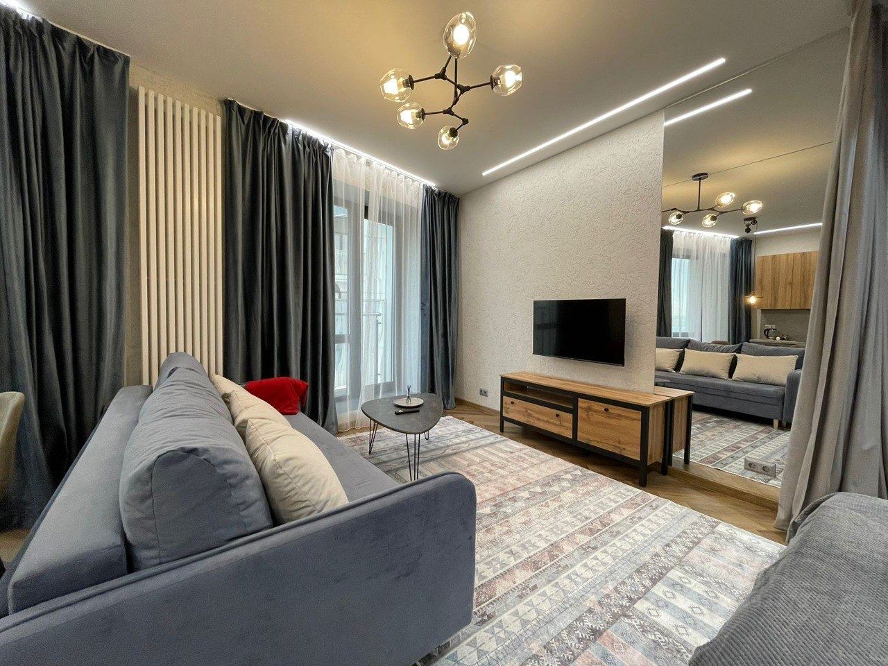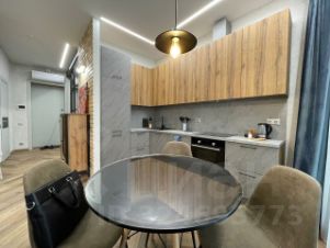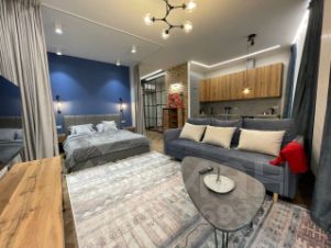 Квартира выполнена в дизайнерском стиле и полностью меблирована. Здесь есть все необходимое для комфортного проживания: кондиционер, телевизор, стиральная и посудомоечная машины, а также холодильник. Ванная комната оборудована современной душевой кабиной. Вся мебель на кухне и в жилой комнате отлично гармонирует с общим стилем квартиры.