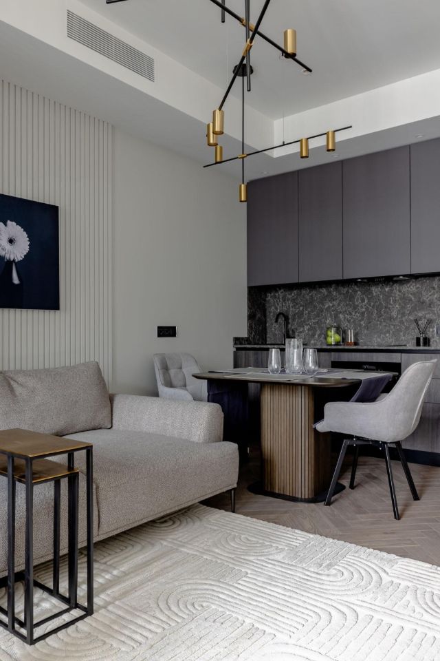 В квартире выполнен дизайнерский ремонт, что придаёт ей стильный и современный вид. Просторная комната и полностью оборудованная кухня с мебелью обеспечивают комфортное проживание. Для вашего удобства в наличии кондиционер, холодильник и стиральная машина. Ванная комната оснащена душевой кабиной и совмещена с санузлом.