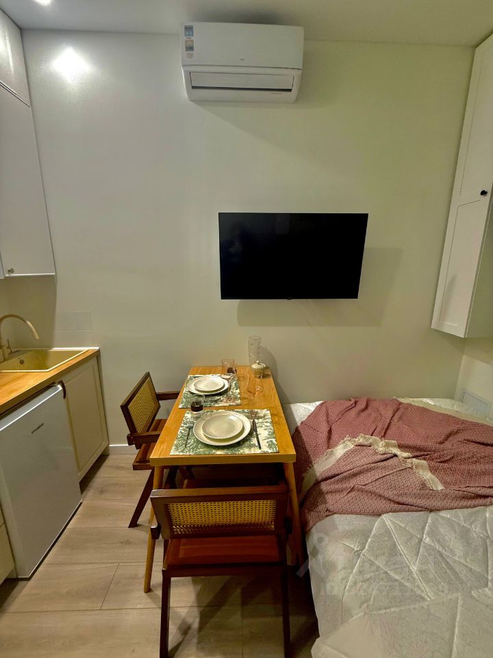 • Полностью оборудованная кухня: варочная панель, СВЧ, чайник, мини-холодильник, посуда, столовые приборы.
