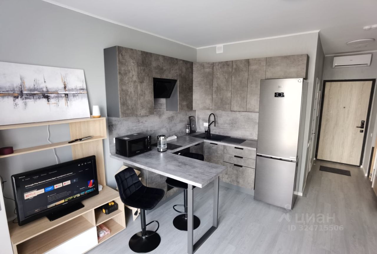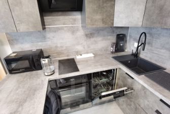 Идеально для одного человека или пары. Вся необходимая техника: посудомоечная и стиральная машины, холодильник, кондиционер, варочная панель, вытяжка, микроволновка, телевизор, умная колонка, чайник, пылесос.