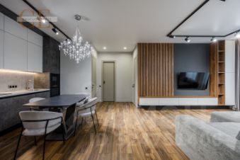 Интерьер выполнен в сдержанной современной палитре с акцентом на натуральные материалы — дерево, камень, тёплые текстуры. Идеальное сочетание эстетики, практичности и комфорта.