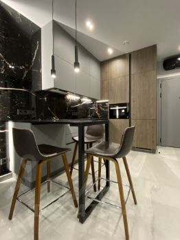 Каждый уголок квартиры наполнен комфортом и изысканным вкусом. Кварцевый агломерат столешницы и острова придает интерьеру благородство и долговечность, а современный керамогранит подчеркивает гармонию стиля и функциональности. Светильники создают особую атмосферу, делая каждый вечер незабываемым.
