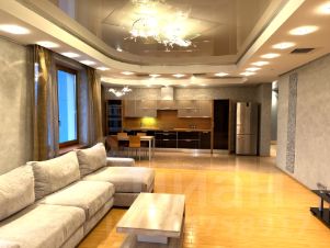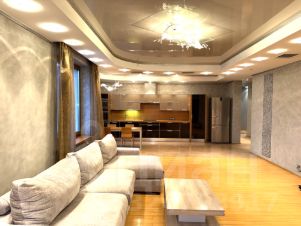 Выполнен качественный дизайнерский ремонт с использованием натуральных материалов высокого качества: на полу в комнатах и гостиной паркет, в прихожей, санузлах, кухне плитка с подогревом; панорамные окна, качественные межкомнатные двери, функциональная планировка: кухня-гостиная, 2 спальни, кабинет - дополнительная гостевая комната, большая гардеробная, просторный холл, 2 сан.узла с ванной джакузи и душевыми кабинами, высокие потолки 3,2 метра, центральное кондиционирование, кухня гостиная 60 кв.метров с со всей необходимой встроенной мебелью и техникой Kuppersbusch и Miele (холодильник, посудомоечная машина, индукционная варочная панель, духовой шкаф, вытяжка),