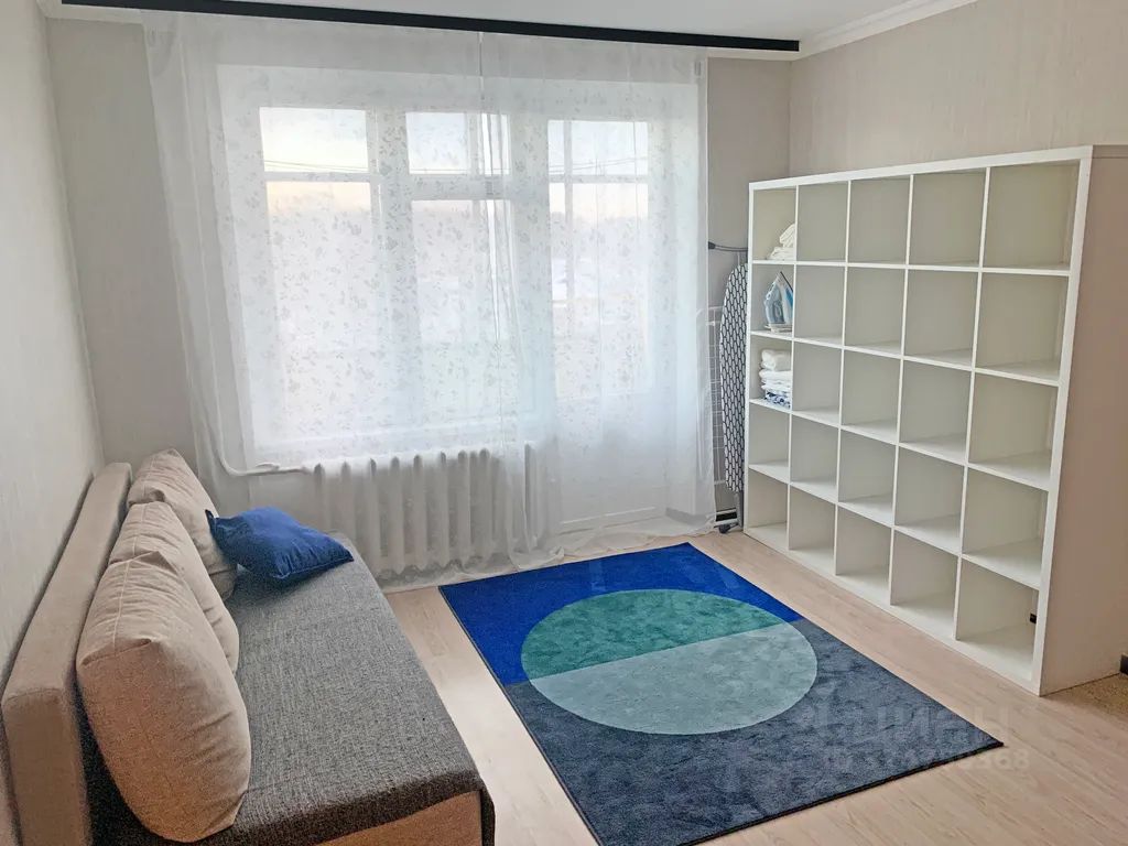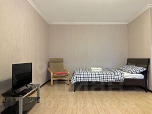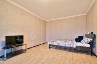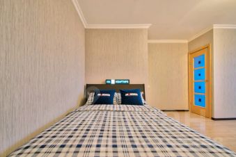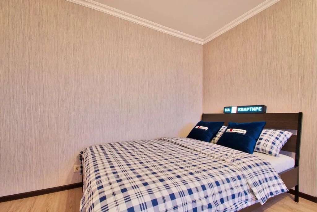 Апартаменты очень удобны, как для семейной пары, так и для командировочных. Кровать находится напротив телевизора, в просторной комнате.