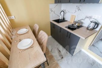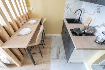 Кухонная зона оснащена всем необходимым для приготовления пищи: есть чайник, электрическая плита, холодильник и микроволновая печь. Таким образом, вы сможете наслаждаться домашней едой, не выходя из студии.