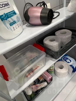 Из техники: холодильник, электрическая индукционная варочная панель, электрочайник, микроволновая печь, утюг, фен, напольная сушка для белья, гладильная доска.