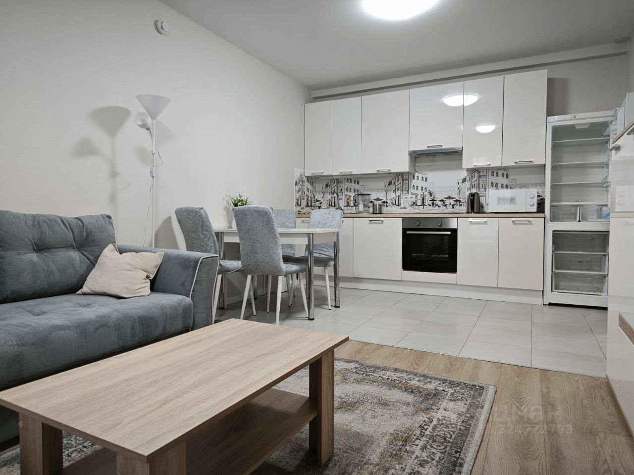 Кухня-гостиная: встроенный кухонный гарнитур, варочная поверхность, духовой шкаф, микроволновая печь, посудомоечная машина, холодильник, обеденная зона, диван (раскладной, спальное место), кондиционер