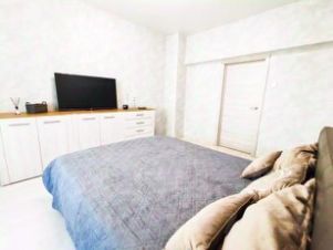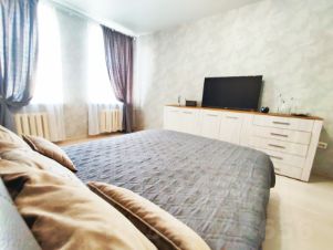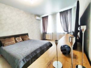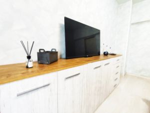 Квартира и комната меблирована, для удобства имеется двуспальная кровать с подъемным механизмом, 2 шкафа для личного хранения вещей, комоды, тумбы, телевизор, установлено кондиционирование.
