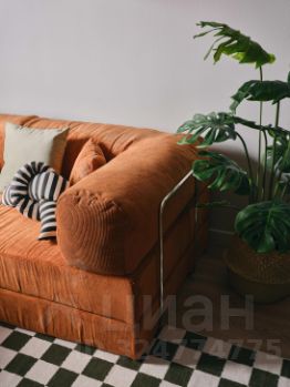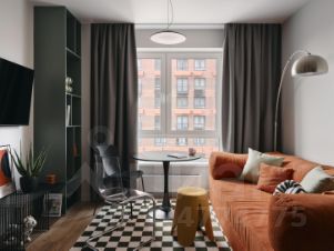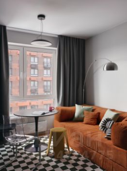 В гостиной: обеденная зона и модный диван, который превращается в огормную кровать для просмотра кино или размещения гостей