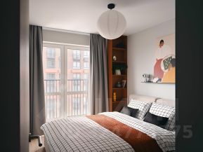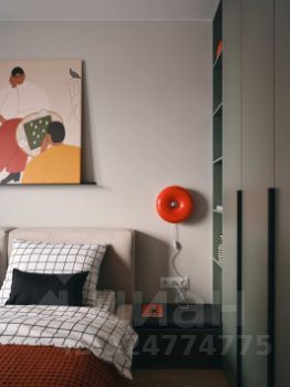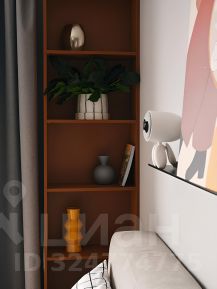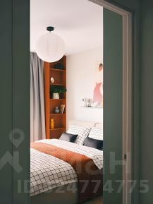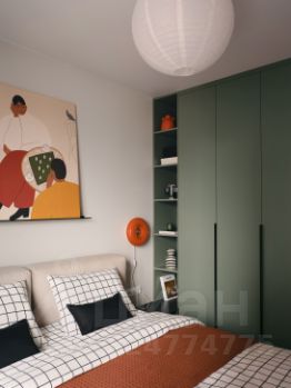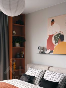 В спальне кровать, проектор, вместительный шкаф и открытые стеллажи
