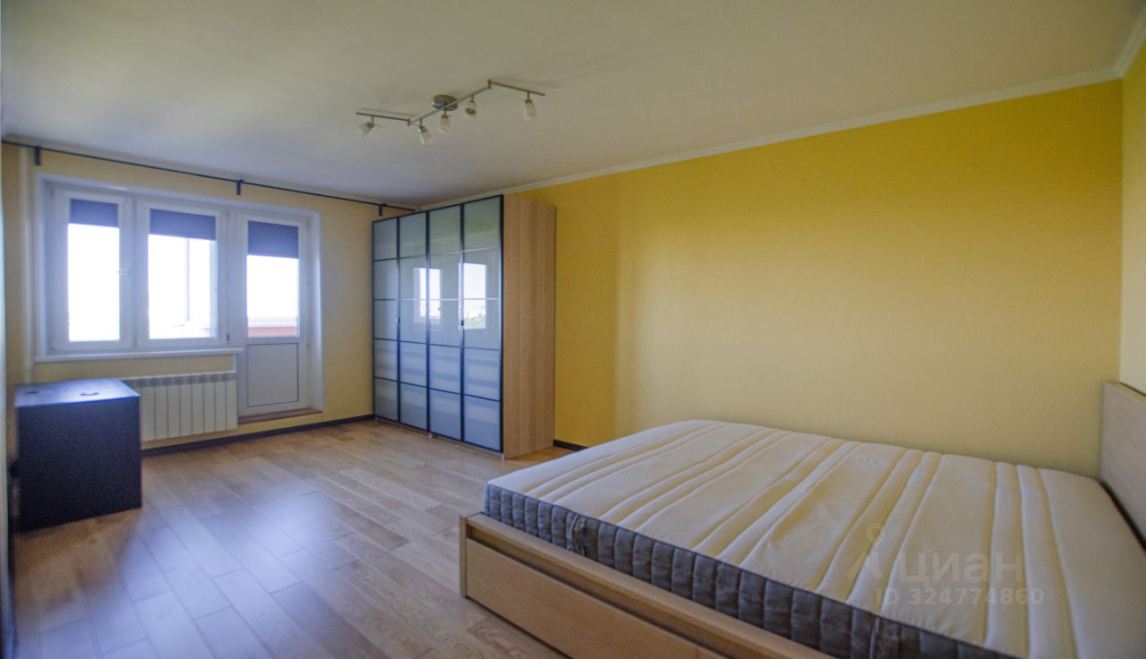 Просторная комната с выходом на застекленный балкон, полностью меблирована: имеются двуспальная кровать, практичные системы хранения, включая шкаф с зеркалами.