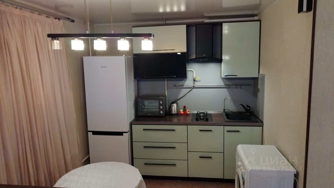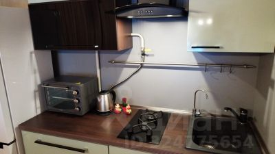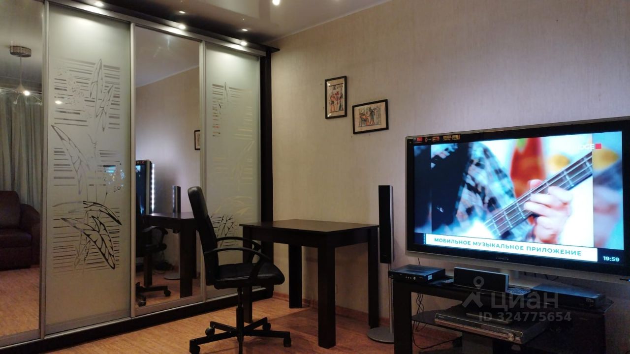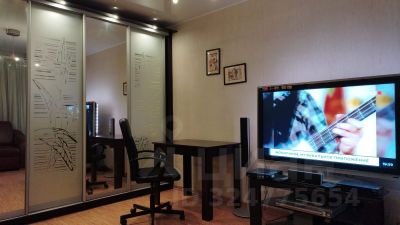 В комнате большой ТВ с акустической системой, подключено кабельное телевидение 200 каналов. Есть встроенный шкаф-купе с подсветкой, большой диван из натуральной кожи, компьютерный стол. Кухонная зона оборудована холодильником, стиральной машиной, встроенной современной кухней с газовой варочной панелью и эл