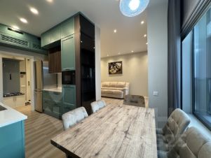 Ранее не сдавалась, все новое. Сдается двухкомнатная квартира с качественным дизайнерским ремонтом с использованием дорогих строительных материалов в новом Жилом комплексе. Кухонный гарнитур со всей бытовой техникой, система кондиционирования, система фильтрации воздуха, фильтры воды, теплые полы, постирочная комната с стиральной и сушильной машинами. Хорошая мебель: двухспальная кровать с ортопедическим матрасом, диван, шкафы. Есть машиноместо в подземном паркинге за отдельную плату. Охраняемая территория, в подъезде сидит охранник. Развитая инфраструктура и транспортная доступность. Рядом с домом парк с прудом и в 5 минутах пешком парк Фили. Рядом спорт клубы - Олимпик Стар, World Class Кунцево. Без домашних животных.