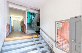 Дом в хорошем состоянии, оборудован двумя пассажирскими лифтами и мусоропроводом. Подъезд ухоженный, а придомовая территория благоустроена.