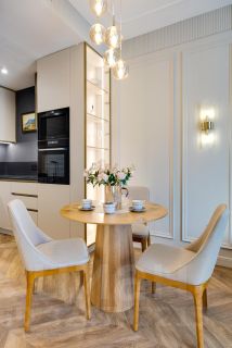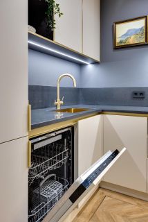 • встрoенная кухня с посудомоечной машиной, духовым шкафом, микроволновкой, варочной панелью, вытяжкой, встроенным холодильником;