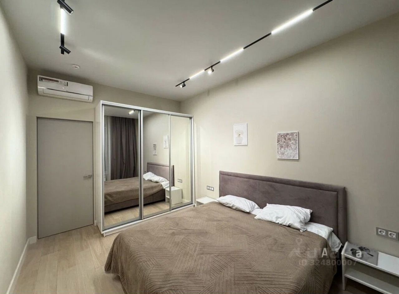 Двуспальная кровать Аскона, прикроватная тумба, журнальный столик, шкаф купе с зеркальными дверьми, шкаф в прихожей с зеркальными дверьми, в кухне-гостиной: раскладной диван, обеденный стол и 4 стула
