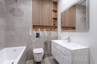 — Совмещенный санузел, в котором расположен унитаз с инсталляцией, ванна, места хранения под раковиной, а также в стеновой нише