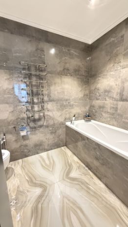 Особое внимание уделено удобству — в апартаментах два совмещенных санузла, один из которых оборудован ванной, а второй — душевой кабиной.