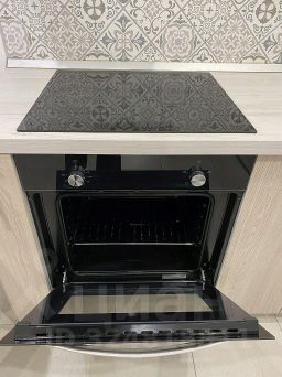 -кухонный гapнитуp, стол обеденный, 2 стула, xолодильник Candy, электрическая варочная панель и духовой шкаф Are, вытяжка, микроволновка Haier;