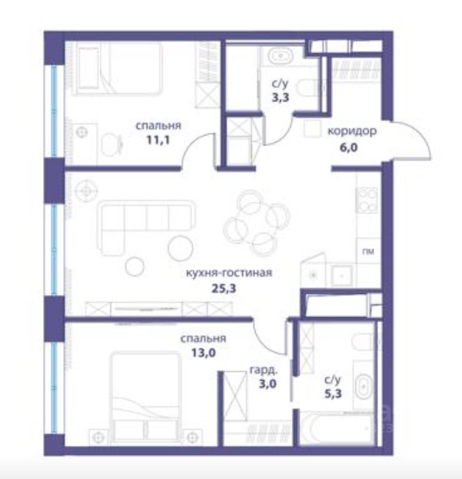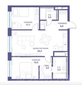 Общая площадь: 67.3 кв.м., с двумя изолированными спальнями, одна из которых мастер спальня со своей гардеробной и своей ванной комнатой, кухня - гостиная 25 кв.м., гостевой санузел с душевой кабиной. Квартира расположена на 18 этаже.