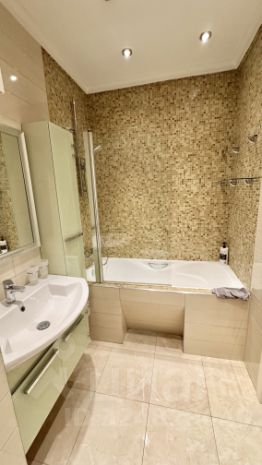 В комнате установлен кондиционер. Санузел совмещенный, оформлен плиткой, оснащен ванной и стиральной машиной.