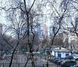 Вид из окон зала, светлой спальной и кухни - во двор, а из спальни с серой кроватью с застекленной лоджией - на ТЦ Европейский.