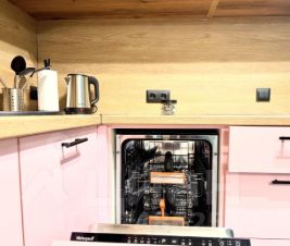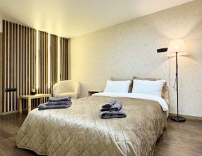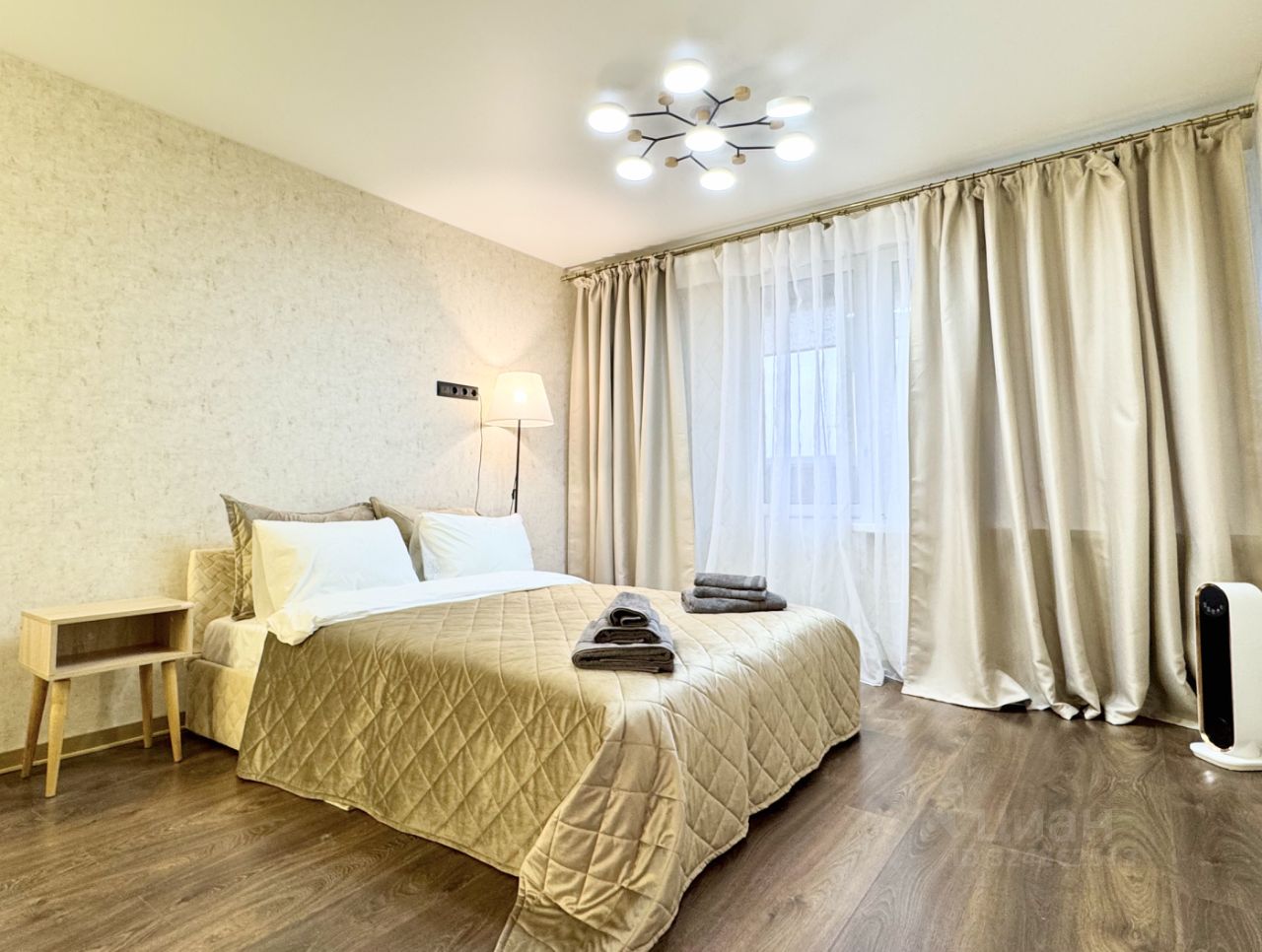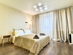 Комфортное проживание от 3 суток: двуспальная кровать с ортопедическим матрасом, кухня с зоной готовки и отдыха, полный набор техники (посудомойка, стиральная машина, холодильник, микроволновка, варочная панель), телевизор с цифровыми каналами, гардеробная, большой утеплённый балкон с тёплым полом и сушилкой для белья.