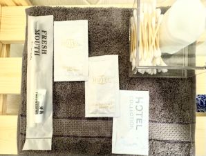 Санузел оборудован всем необходимым: фен, одноразовые наборы (шампунь, гель для душа, кондиционер, зубная паста и щётка), по три полотенца на гостя.