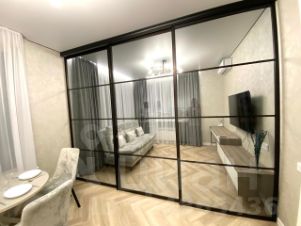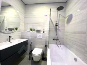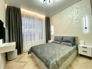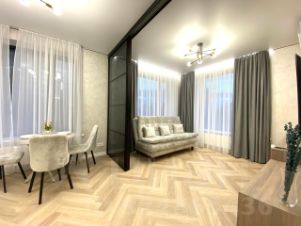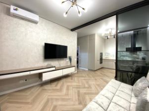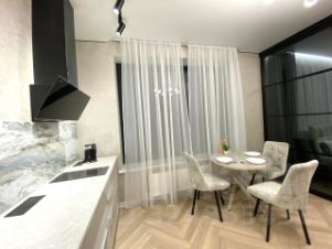 В квартире выполнена уникальная планировка, благодаря которой может быть формат как Евро-2, так и полноценная 2-х комнатная квартира, за счет отделения комнаты от кухни стеклянными раздвижными дверьми.