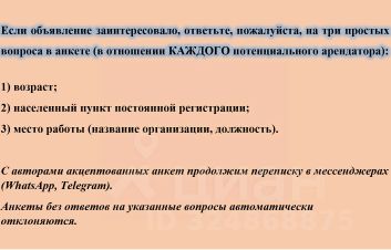 Если объявление заинтересовало, ответьте, пожалуйста, на три вопроса в анкете (в отношении КАЖДОГО потенциального арендатора):