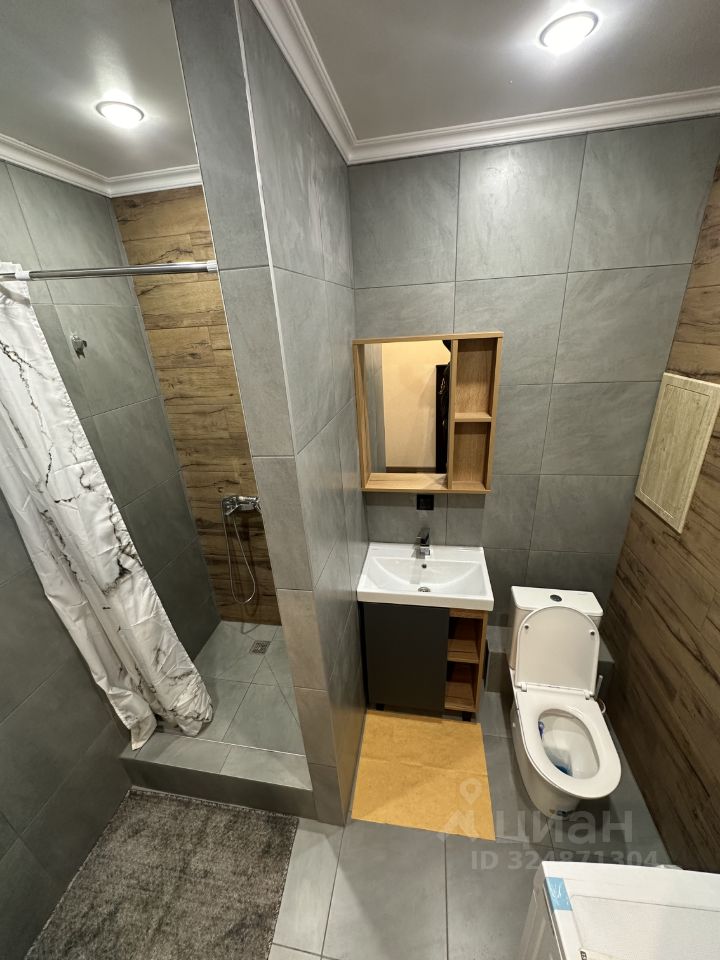 Студия с евроремонтом полностью готова к проживанию. В комнате и на кухне есть вся необходимая мебель. Кухня площадью 6 кв. м оснащена холодильником, а также здесь вы найдёте кондиционер, телевизор и стиральную машину. В ванной комнате установлена душевая кабина.
