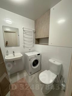 В ванной комнате установлен просторный шкаф для хранения бытовой химии и косметики, зеркало с подсветкой, тихая инвертерная с/м Weissgauff.