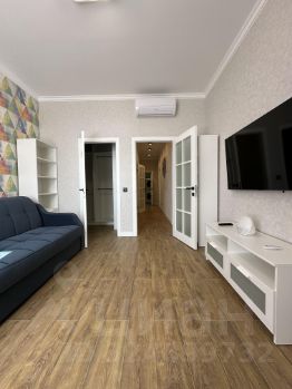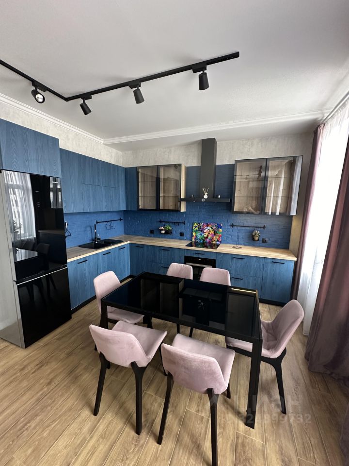 В зоне кухни-гостиной вместительный гарнитур со встроенной бытовой техникой (холодильник, вытяжка, индукционная плита, духовой шкаф со встроенной микроволновой печью, посудомойка), диван, телевизор с диагональю 65 дюймов, кондиционер.