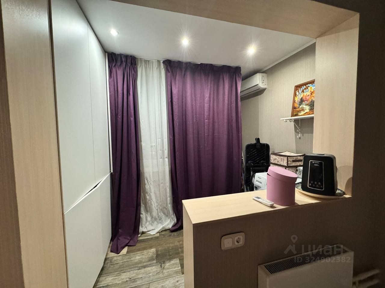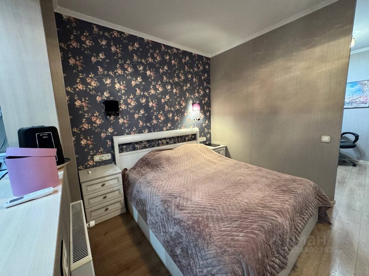 Спальня, разделенная на зоны: двуспальная кровать с подъемным механизмом, прикроватные тумбочки, мебельный гарнитур, телевизор, шкаф и сушильная машина в лоджии, кондиционер, рабочий стол и стул, кресло.