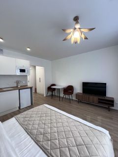 Всё под рукой: полностью оборудованная кухня, вся необходимая техника (холодильник, стиральная машина, СВЧ).