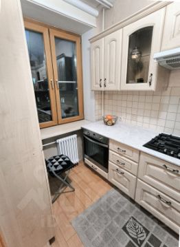 Кухня- настоящий рай для кулинара - оборудована практичной мебелью с встроенной техникой: варочная панель, духовка, вытяжка, посудомоечная машина (все -Electrolux), холодильник Liebherr. Кухня соединена с гостиной (17.7 кв.м), где разместились обеденный стол и гостевой гобеленовый диван, кондиционер, возможно установить телевизор и аудиосистему.